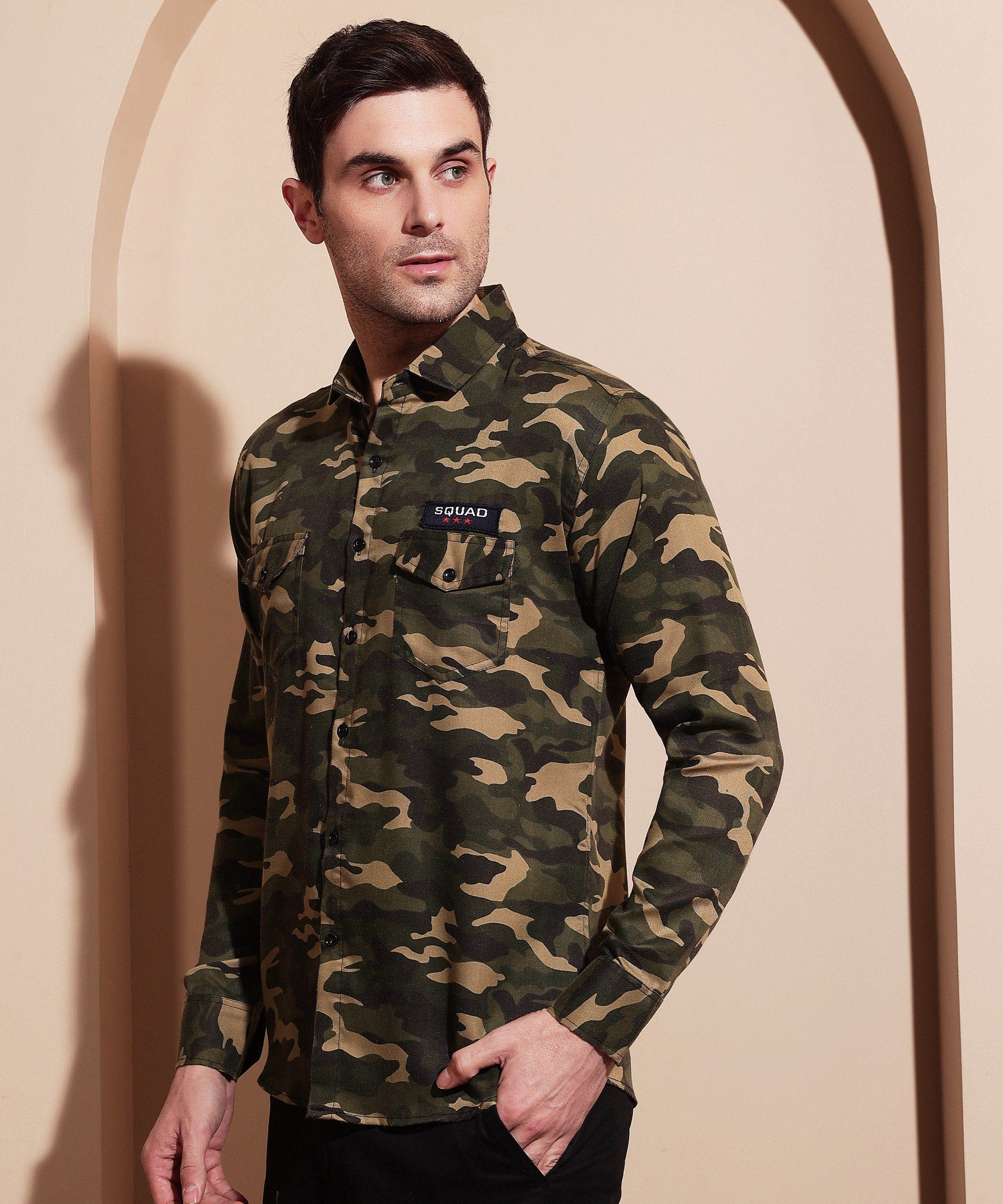 Stand out in style with this cotton blend camouflage shirt, crafted for comfort and a rugged, trendy look. Featuring a military-inspired camo pattern, full sleeves, and twin chest flap pockets, this shirt adds a bold edge to your casual wardrobe. Pair it with jeans, cargo pants, or chinos for a versatile and confident outfit.