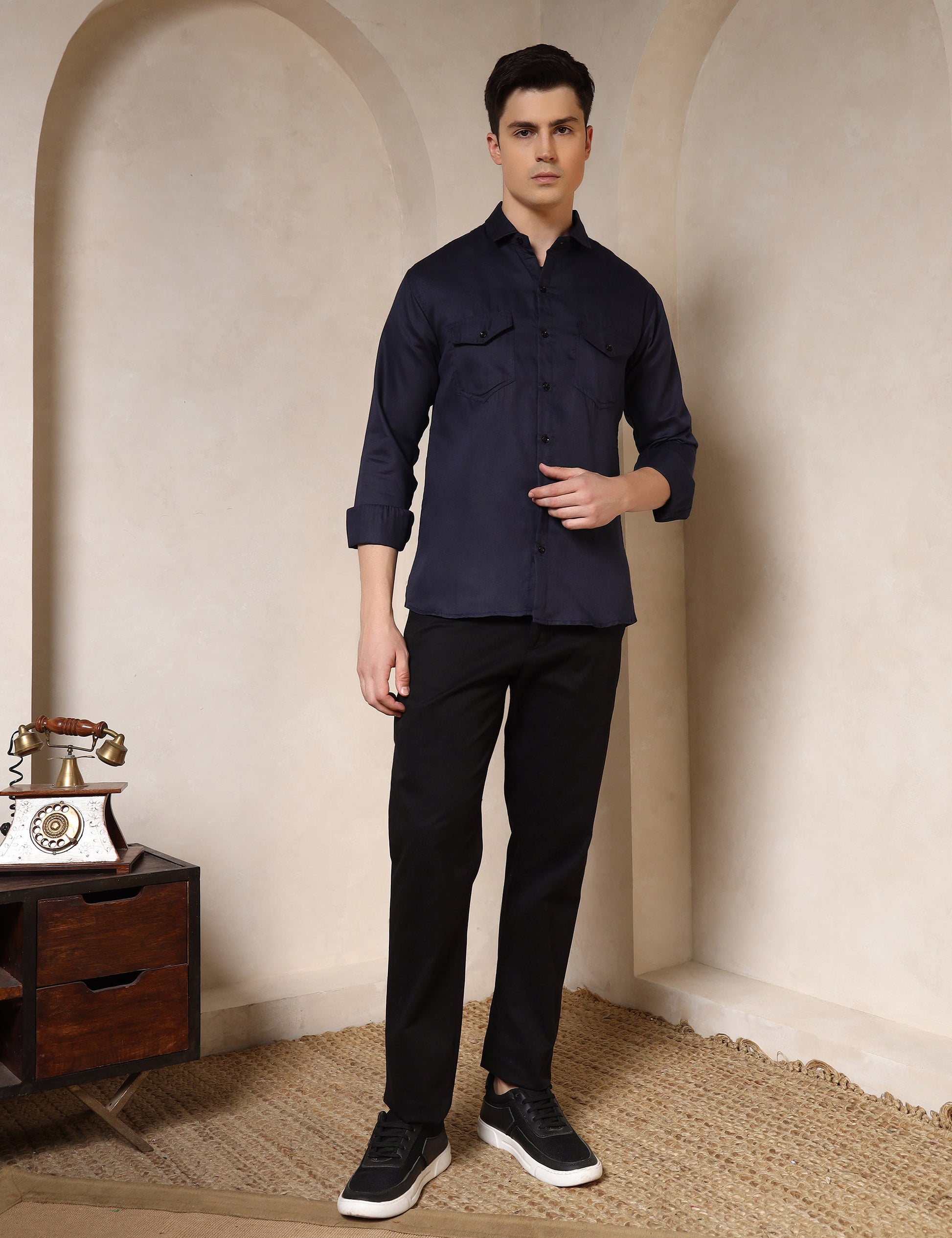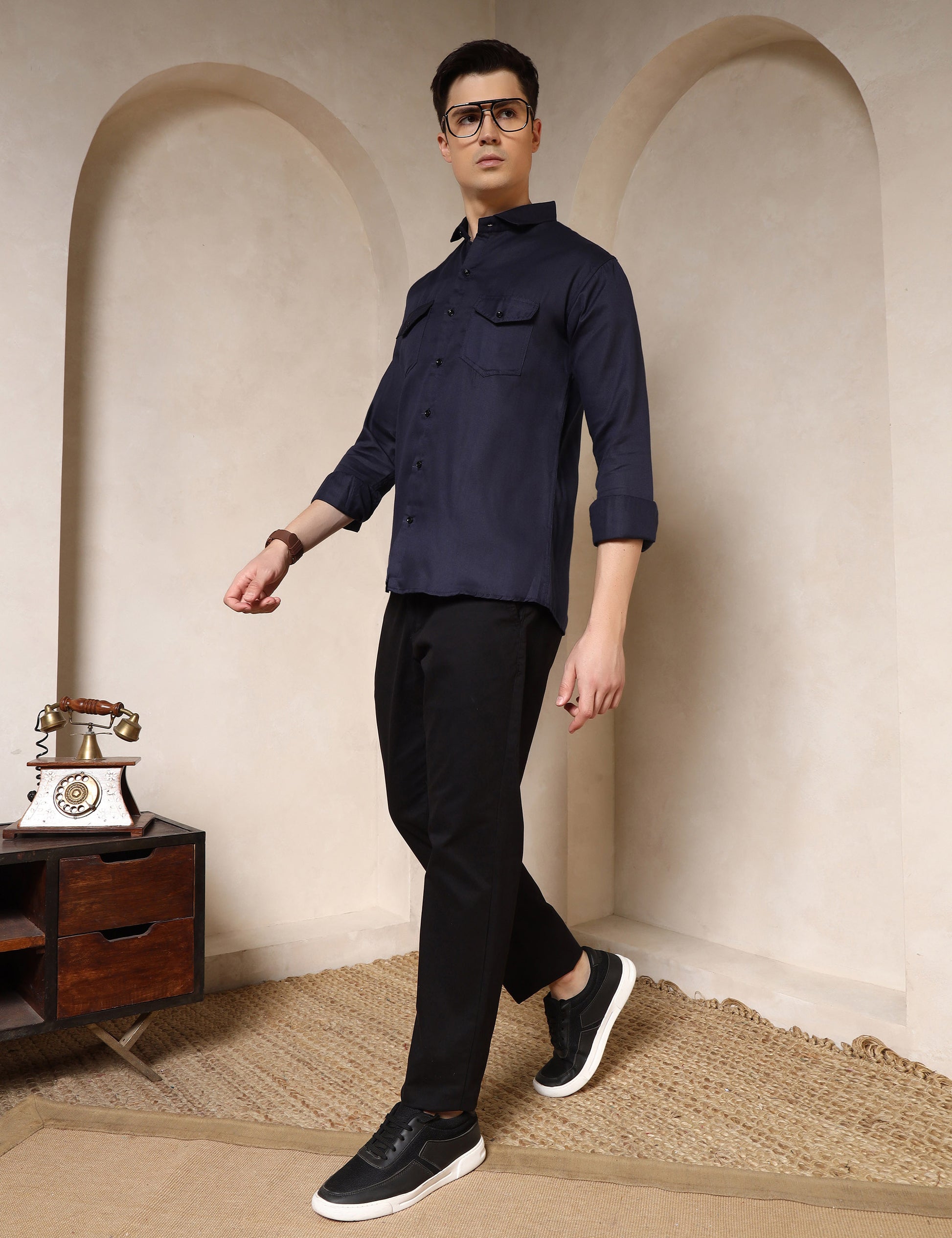 Classic Navy Blue Dual Pocket Cotton Blend Shirt