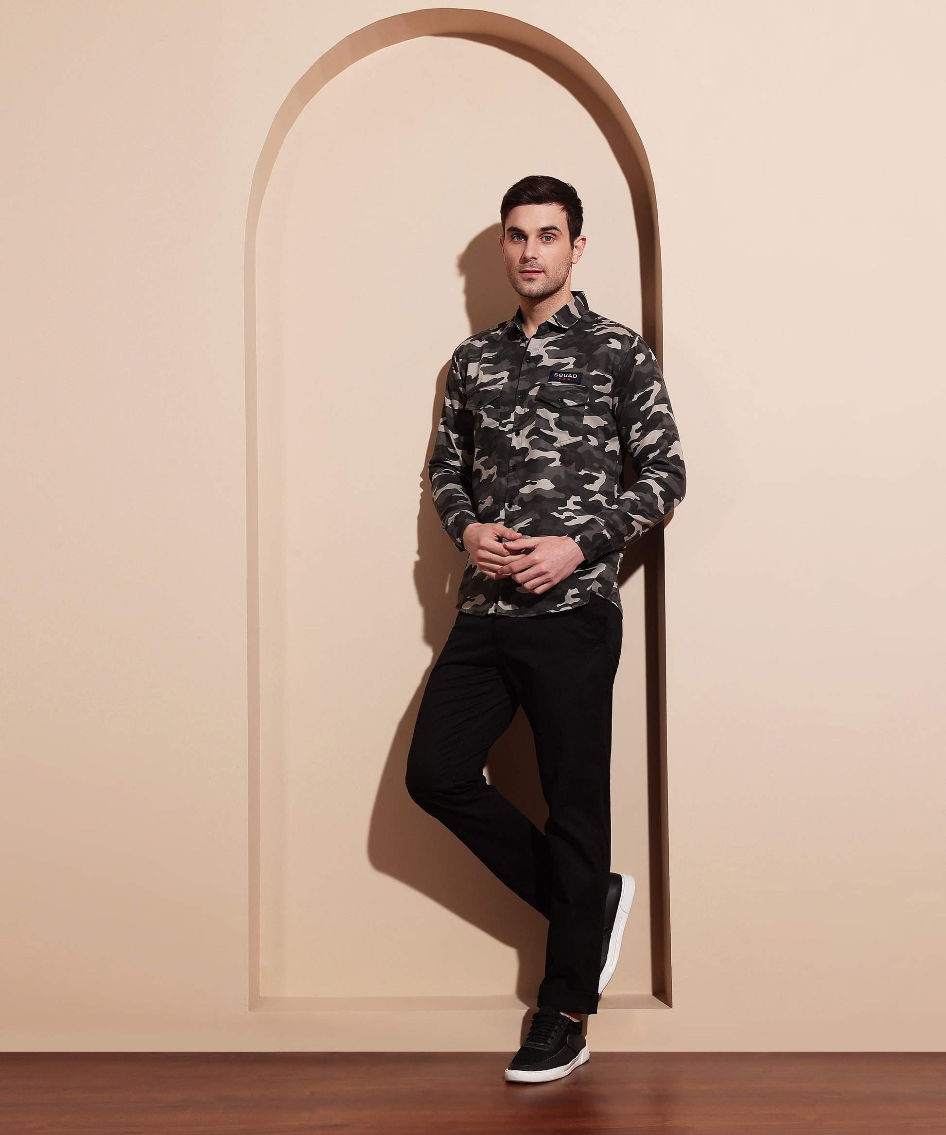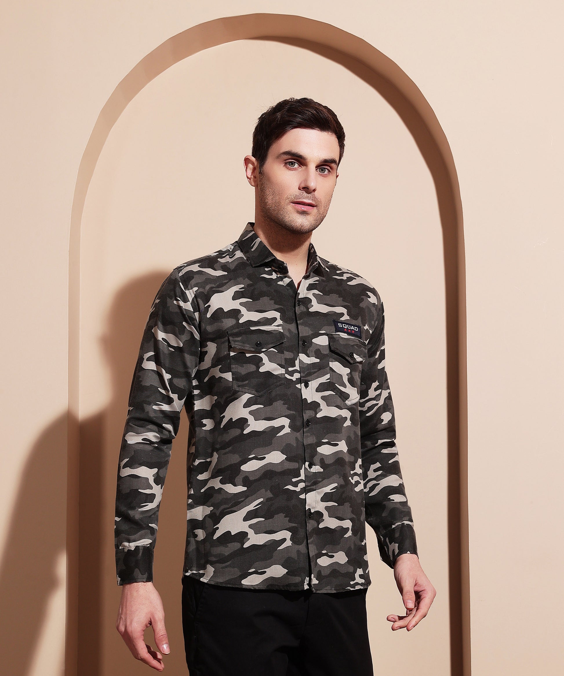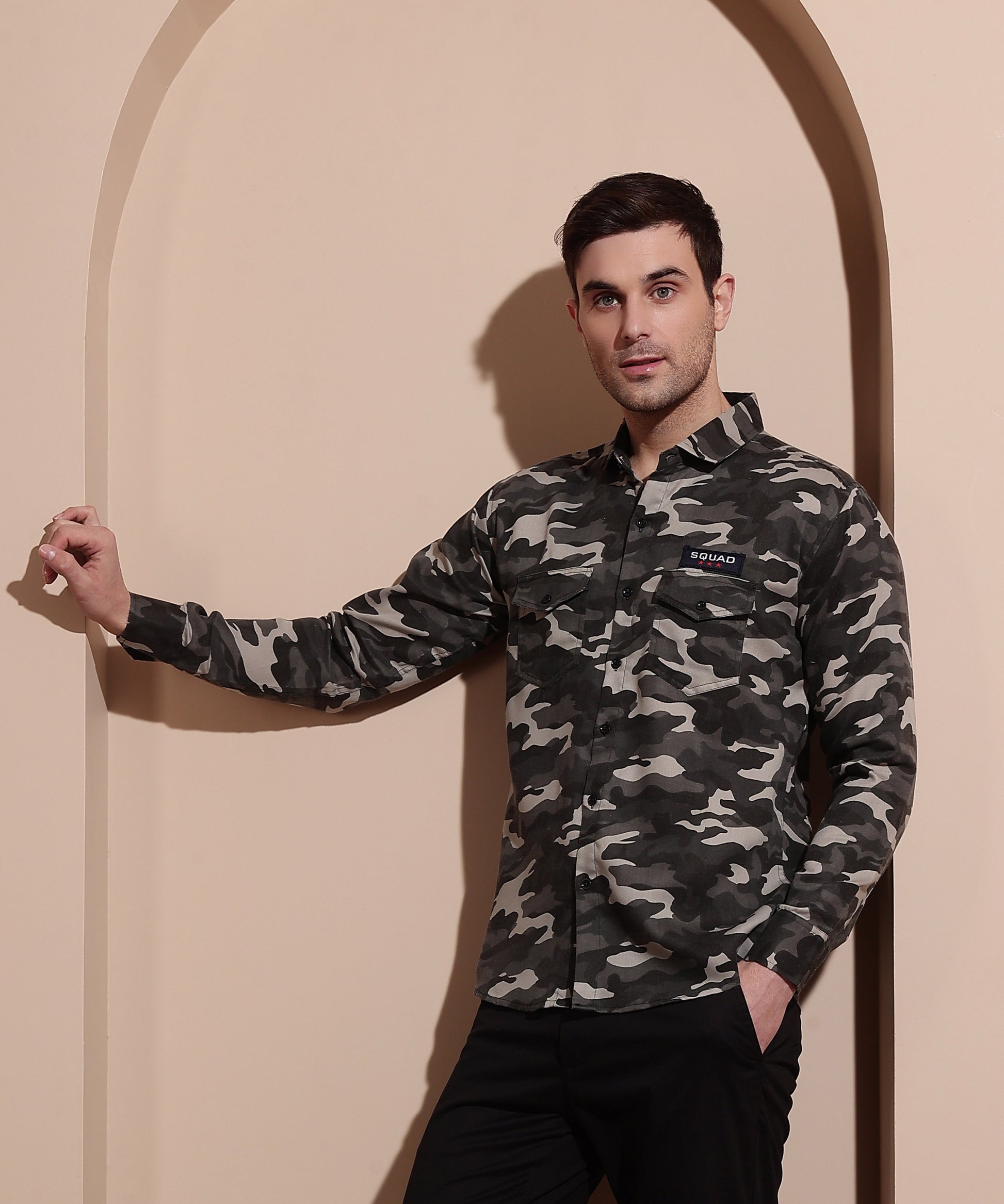 Bring a bold, rugged vibe to your wardrobe with this cotton blend camouflage shirt. Designed with a striking camo print, full sleeves, and twin flap chest pockets, it delivers both style and functionality. Comfortable and versatile, this shirt is perfect for casual outings, weekend adventures, or street-style looks.