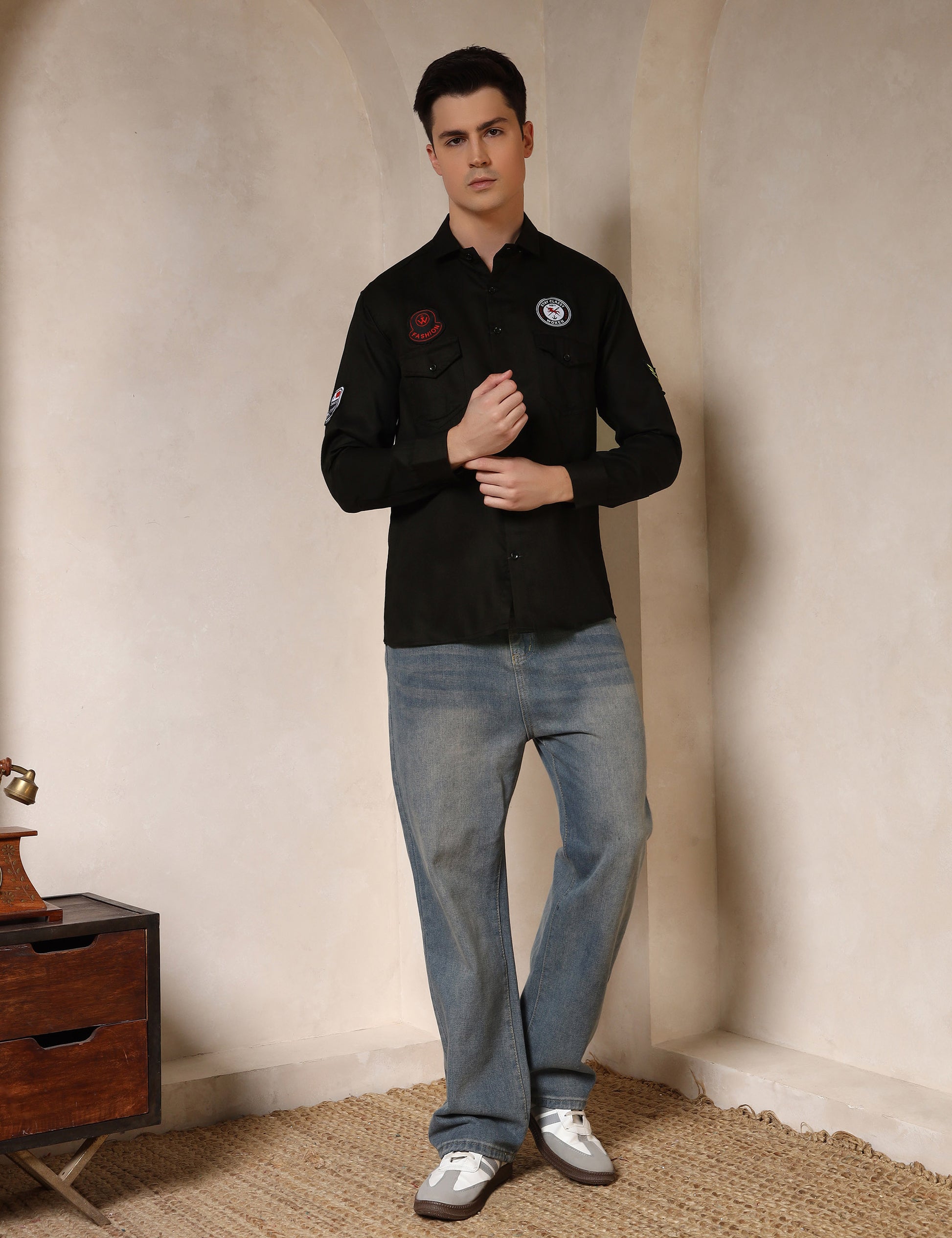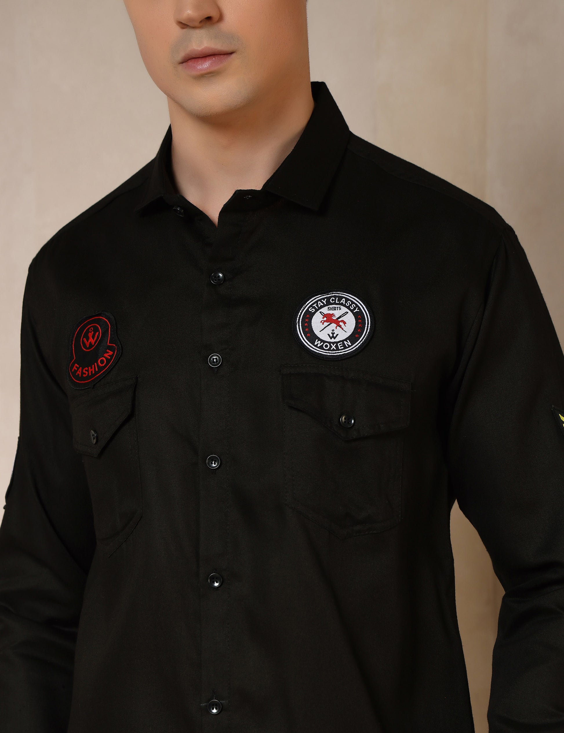 Make a bold style statement with this cotton blend embroidered patch shirt. Designed with unique patchwork detailing on the chest and sleeves, this shirt brings a trendy, casual edge to your wardrobe. Crafted from a breathable cotton blend fabric, it ensures comfort while keeping you effortlessly stylish—perfect for weekend outings, casual gatherings, or everyday wear.
