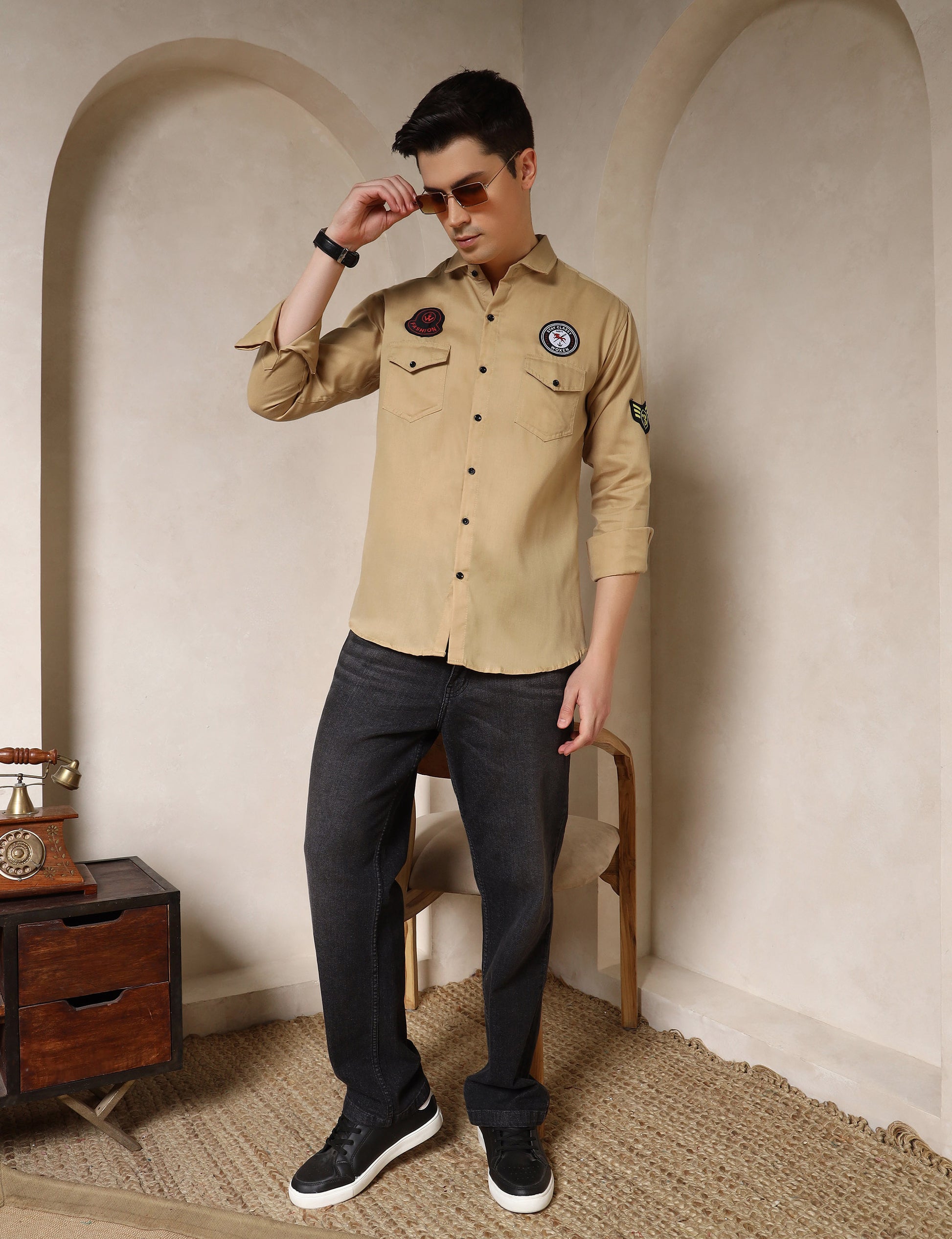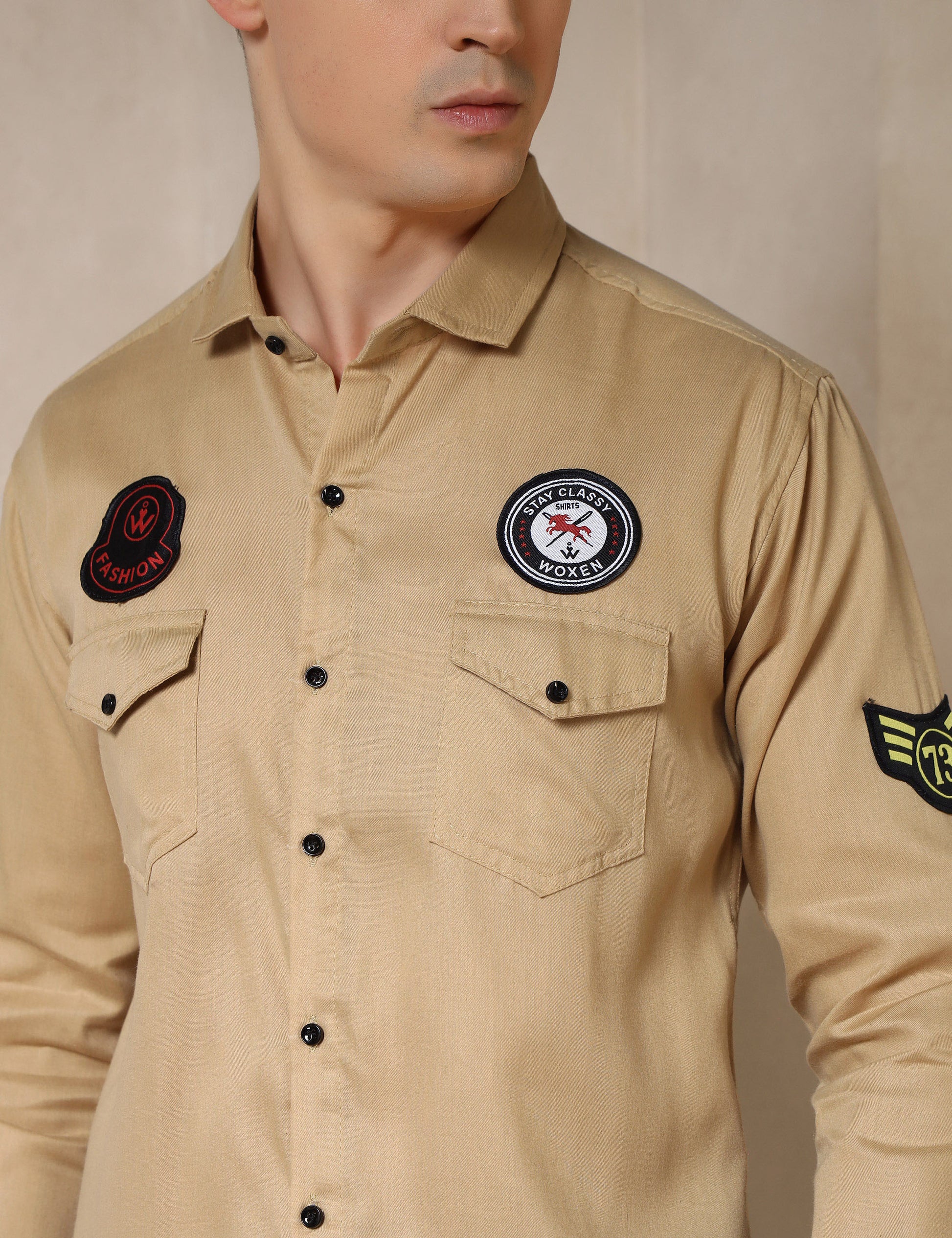 Make a bold style statement with this cotton blend embroidered patch shirt. Designed with unique patchwork detailing on the chest and sleeves, this shirt brings a trendy, casual edge to your wardrobe. Crafted from a breathable cotton blend fabric, it ensures comfort while keeping you effortlessly stylish—perfect for weekend outings, casual gatherings, or everyday wear.