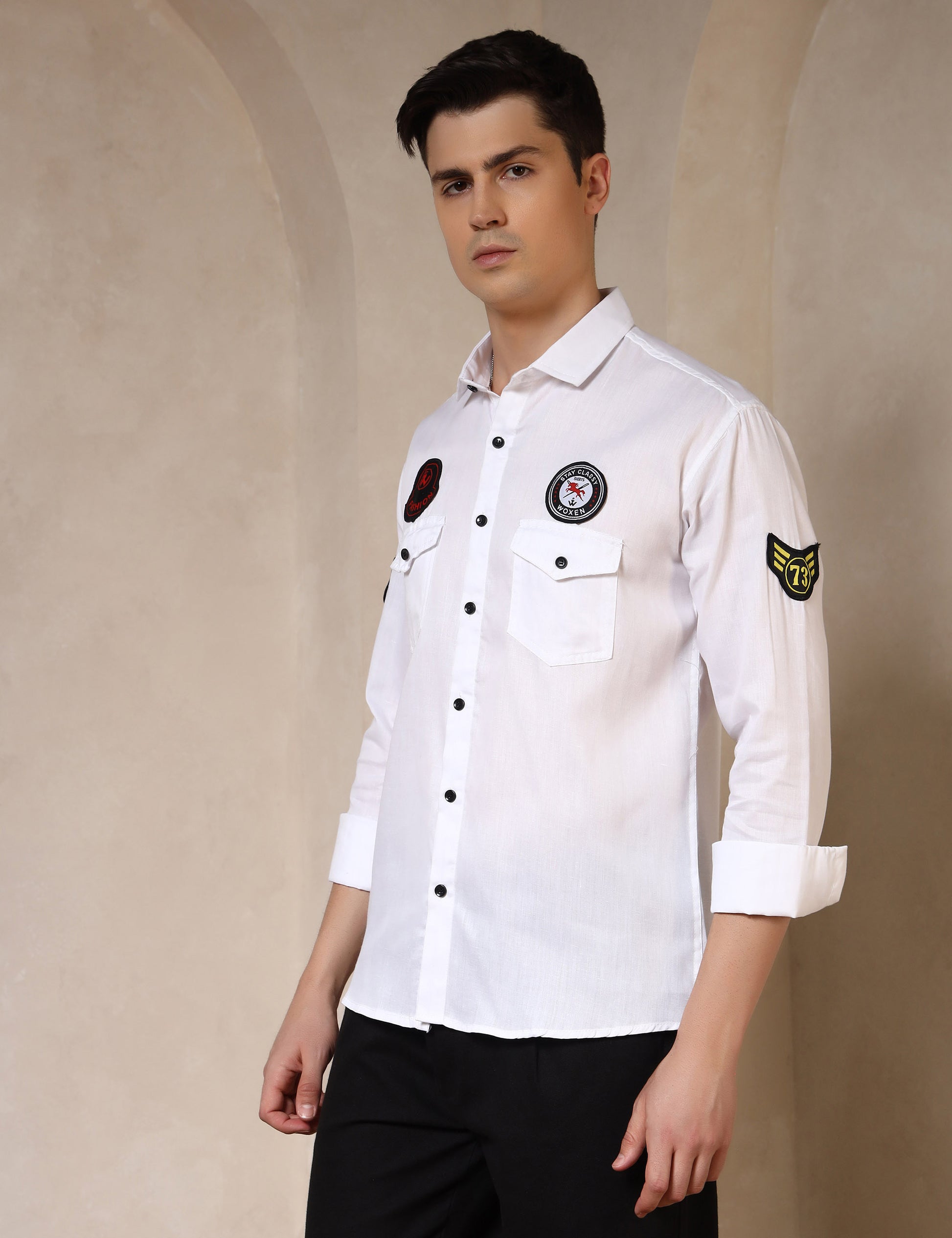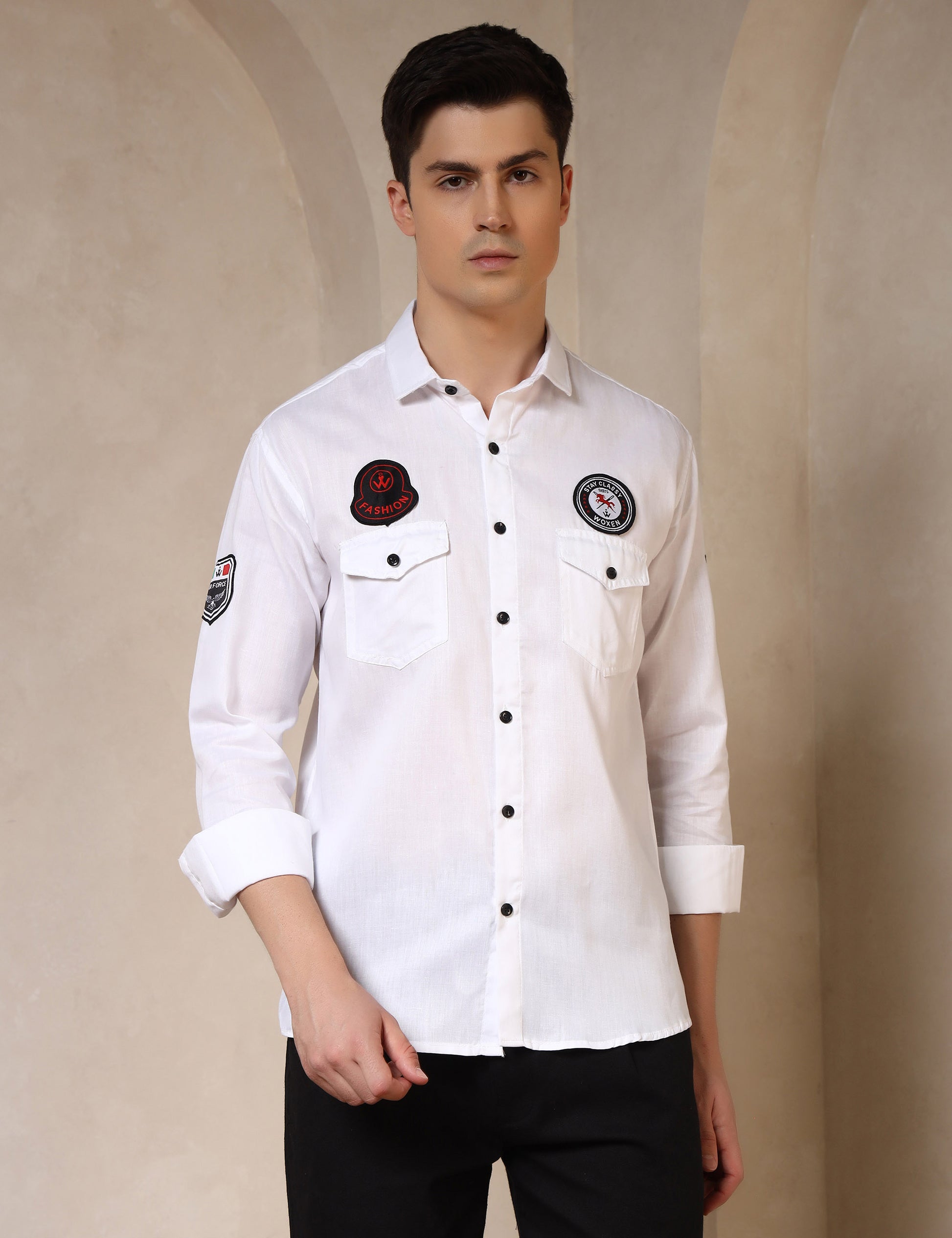 Make a bold style statement with this cotton blend embroidered patch shirt. Designed with unique patchwork detailing on the chest and sleeves, this shirt brings a trendy, casual edge to your wardrobe. Crafted from a breathable cotton blend fabric, it ensures comfort while keeping you effortlessly stylish—perfect for weekend outings, casual gatherings, or everyday wear.